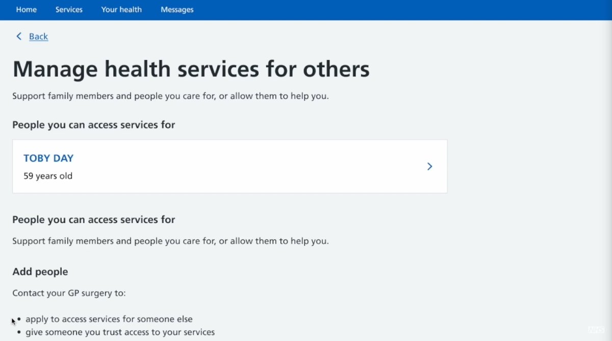 This guide shows you how to add someone's account, access their health records, manage services, such as requesting a repeat prescription on their behalf, and switch between profiles. https://www.nhs.uk/nhs-app/