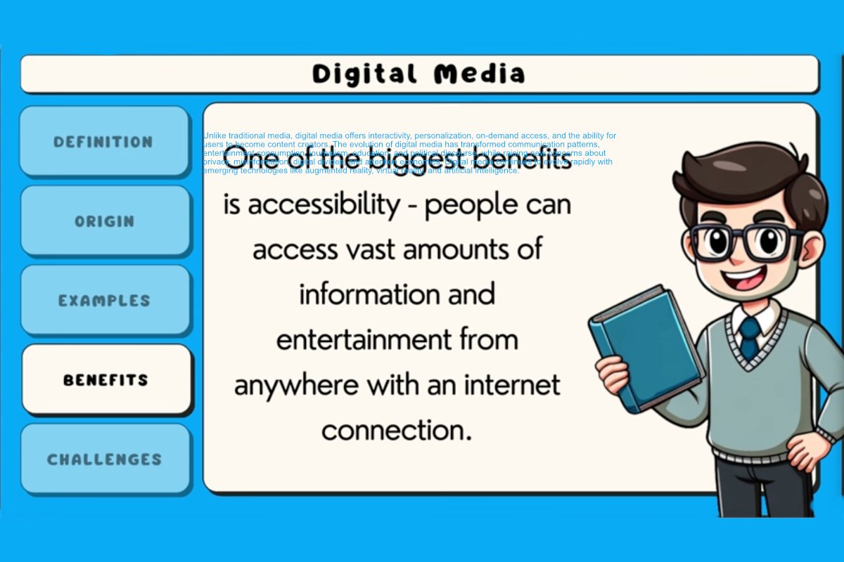 The evolution of digital media has transformed communication patterns, entertainment consumption, journalism, education, and political discourse, while raising new concerns about privacy, misinformation, digital divides, and attention economics.